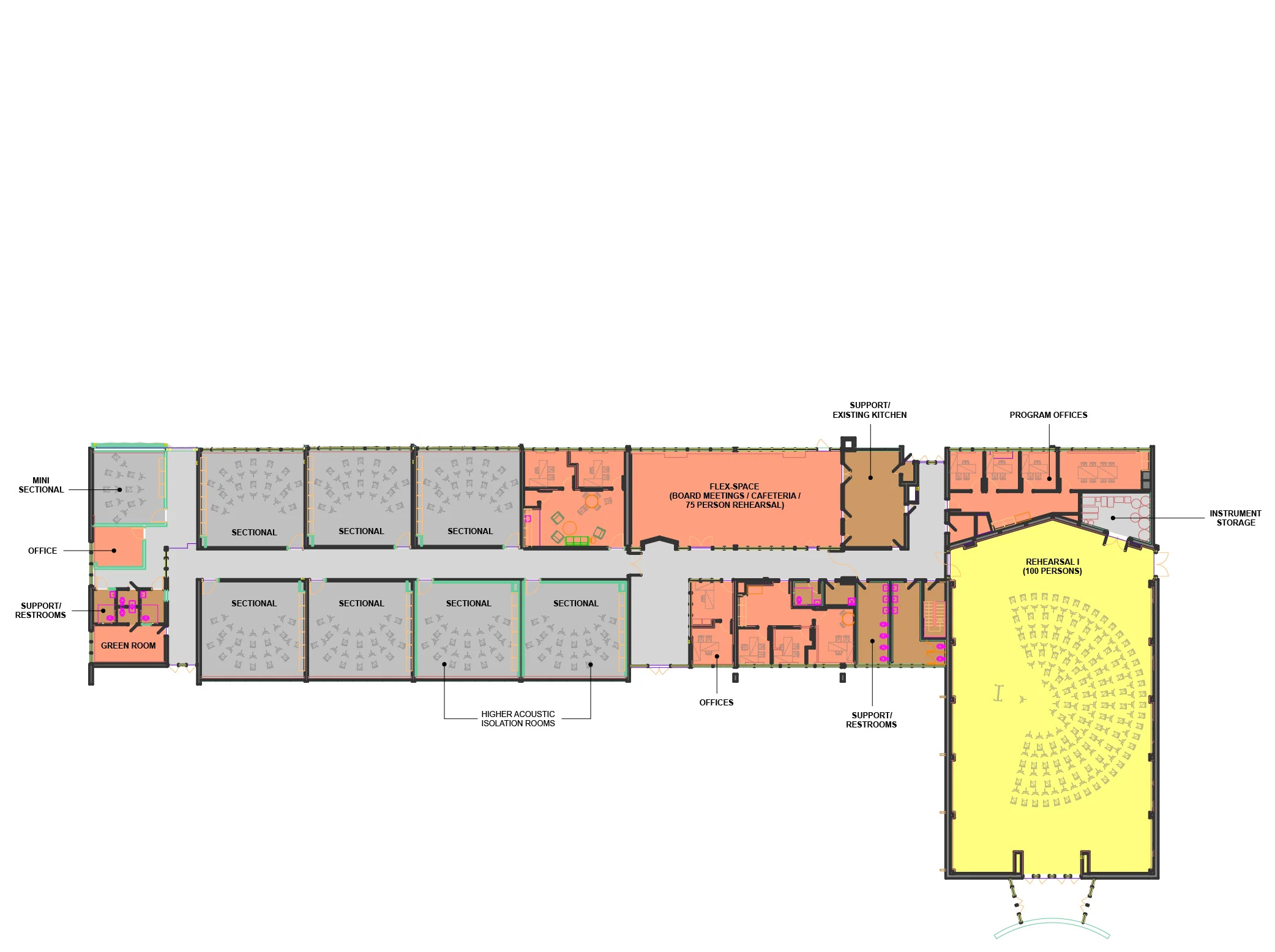 A 4,800sf acoustically designed orchestra rehearsal room At a time when the US Surgeon General has identified a mental health crisis among our youth, our Center will offer students a lifeline. Ample studies point to music’s positive impact on mental health and well-being. The largest investigation on the effect of music and youth brain development was conducted by James Hudziak and his team at the University of Vermont in 2014. Using MRI technology on 232 children ages 6-18, Hudziak concluded that playing music: