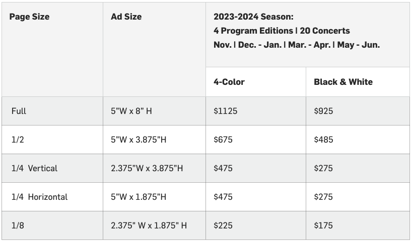 BEST VALUE! Underwriters who reserve a 1/2 page or full-page program book ad also receive a FREE carousel web ad in ESYO’s Virtual Concert Hall.